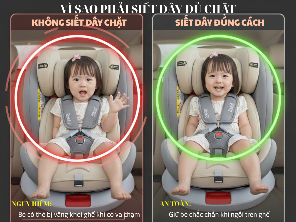 Đây là lỗi thường gặp nhất ở Việt Nam. Nhiều ba mẹ nghĩ chỉ cần “siết vừa phải” là được, nhưng không đủ chặt = không an toàn.