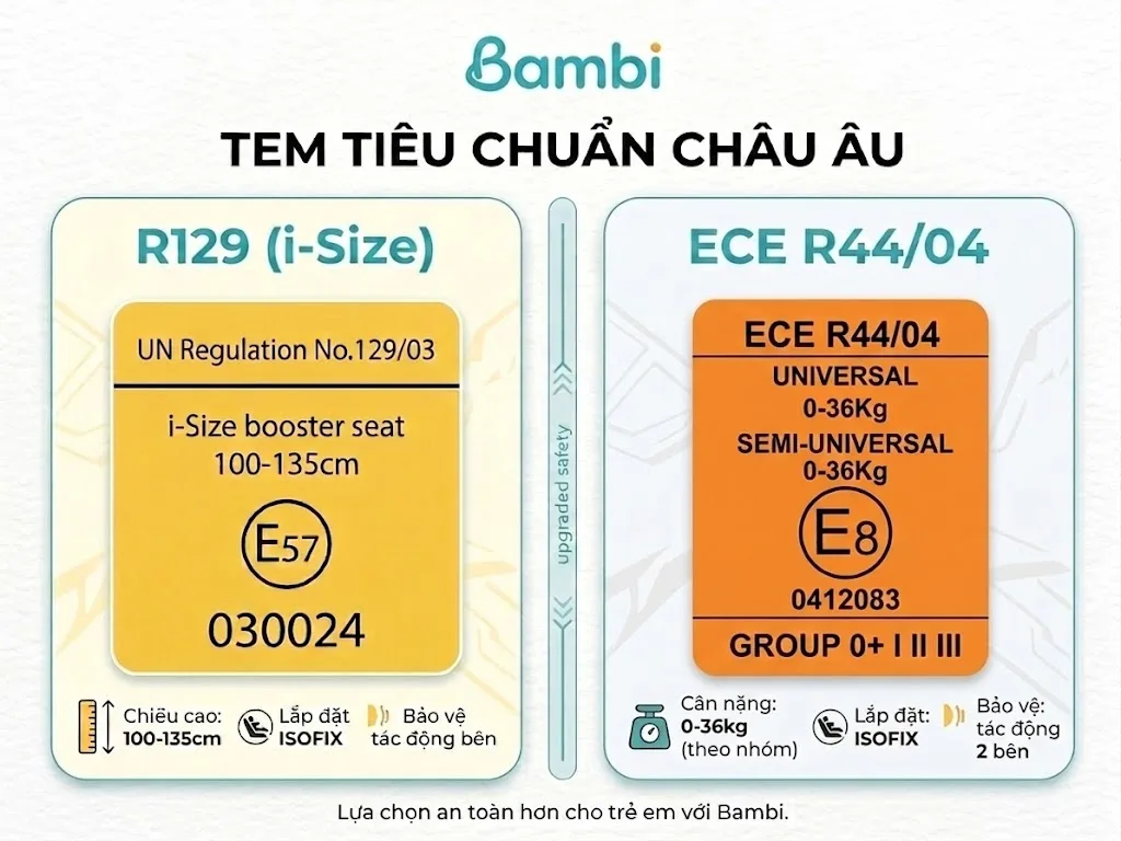 - Đạt tiêu chuẩn an toàn Châu Âu ECE R44/04: Ghế ngồi ô tô cho bé đạt tiêu chuẩn mới và khắt khe nhất hiện nay trong lĩnh vực ghế an toàn cho bé, gọi tắt là i-Size. Tem chứng nhận hợp lệ được in rõ ràng sắc nét trên thân ghế. Và tất nhiên tiêu chuẩn này cũng phủ hợp quy chuẩn tại Việt Nam, ba mẹ có thể yên tâm sử dụng cho con.